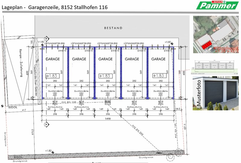 | Beschreibung | Wischfeste Innenfarbe | Betonwände | frostsicherem schalungsglattem Boden | Deckensektionaltor doppelwandig isoliert mit Handsender und Notentriegelung | 2mm Edelputz | LED Leuchtstofflampe | 1 Anschlussdose mit Klappdeckel 250V | |